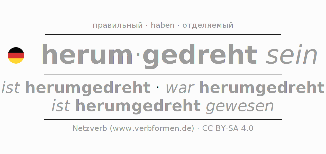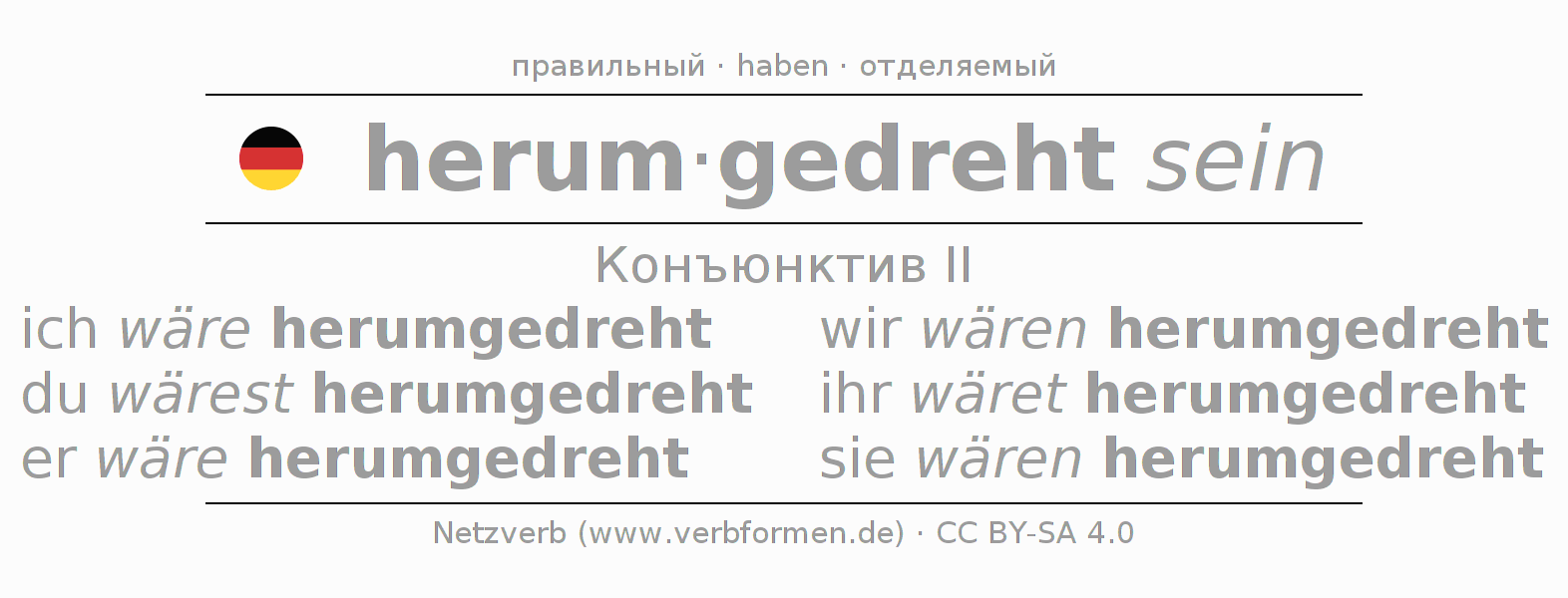 Спряжение herumdrehen в Koнъюнктив Претеритум Сослагательное наклонение Пассив с sein: ich wäre herumgedreht, du wärest herumgedreht, er wäre herumgedreht, wir wären herumgedreht, ihr wäret herumgedreht, sie wären herumgedreht.Образование этих форм происходит по определённым грамматическим правилам. Так же спрягаются простые глагольные формы herumdrehen в Конъюнктив II. Kомментарии ☆