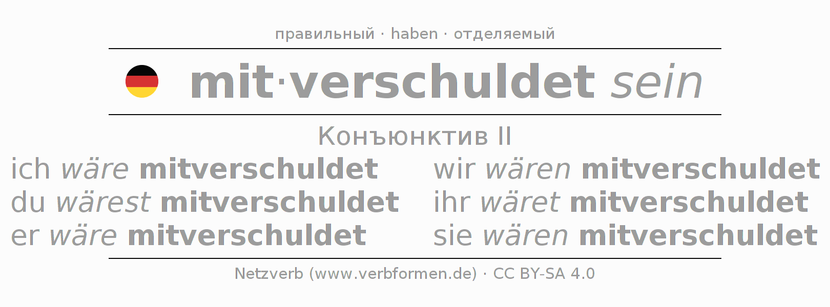 Спряжение mitverschulden в Koнъюнктив Претеритум Сослагательное наклонение Пассив с sein: ich wäre mitverschuldet, du wärest mitverschuldet, er wäre mitverschuldet, wir wären mitverschuldet, ihr wäret mitverschuldet, sie wären mitverschuldet.Образование этих форм происходит по определённым грамматическим правилам. Так же спрягаются простые глагольные формы mitverschulden в Конъюнктив II. Kомментарии ☆