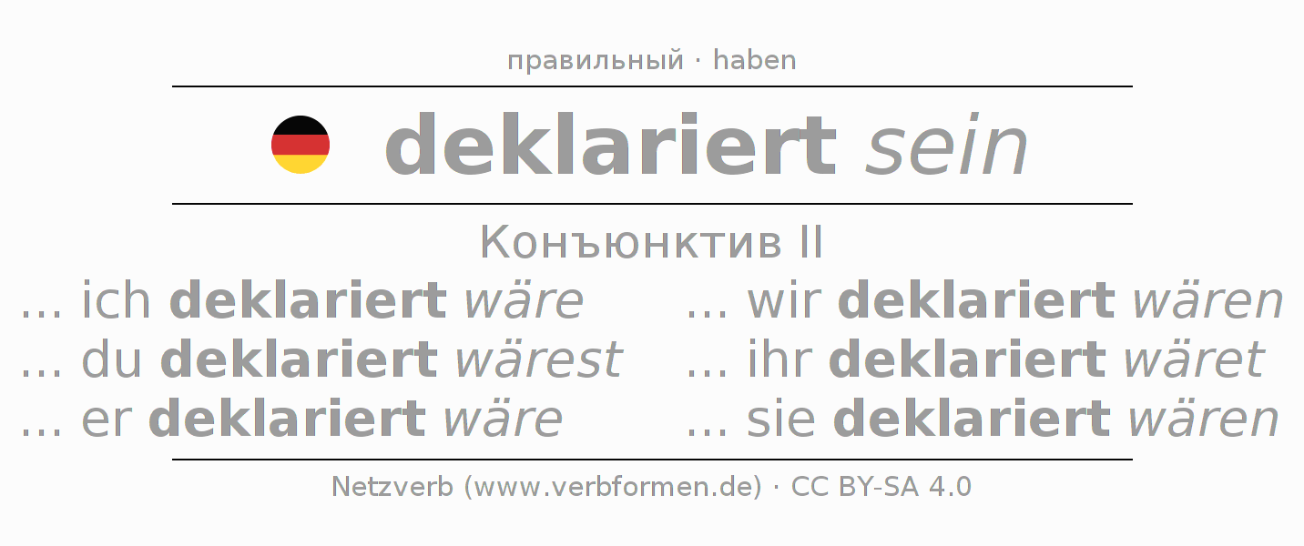Спряжение deklarieren в Koнъюнктив Претеритум Сослагательное наклонение Пассив с sein: ... ich deklariert wäre, ... du deklariert wärest, ... er deklariert wäre, ... wir deklariert wären, ... ihr deklariert wäret, ... sie deklariert wären.Образование этих форм происходит по определённым грамматическим правилам. Так же спрягаются простые глагольные формы deklarieren в Конъюнктив II. Kомментарии ☆