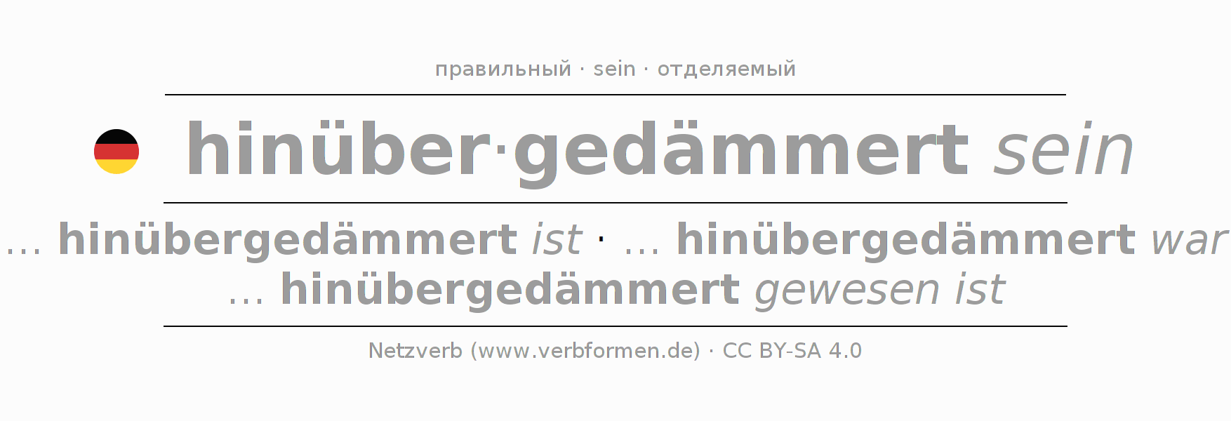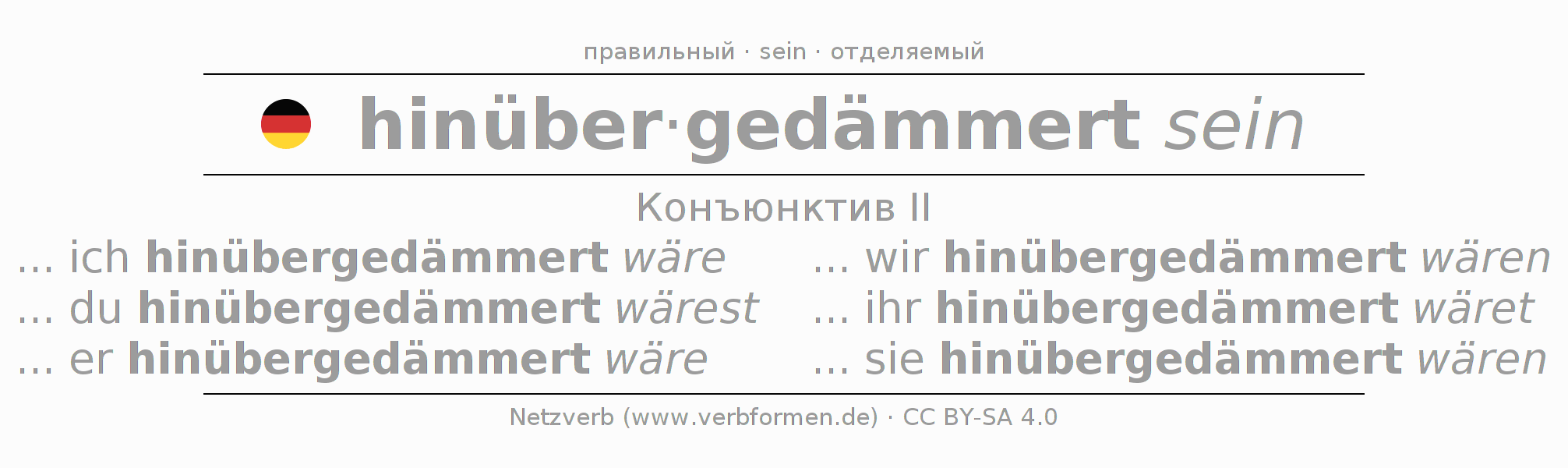 Спряжение hinüberdämmern в Koнъюнктив Претеритум Сослагательное наклонение Пассив с sein: ... ich hinübergedämmert wäre, ... du hinübergedämmert wärest, ... er hinübergedämmert wäre, ... wir hinübergedämmert wären, ... ihr hinübergedämmert wäret, ... sie hinübergedämmert wären.Образование этих форм происходит по определённым грамматическим правилам. Так же спрягаются простые глагольные формы hinüberdämmern в Конъюнктив II. Kомментарии ☆