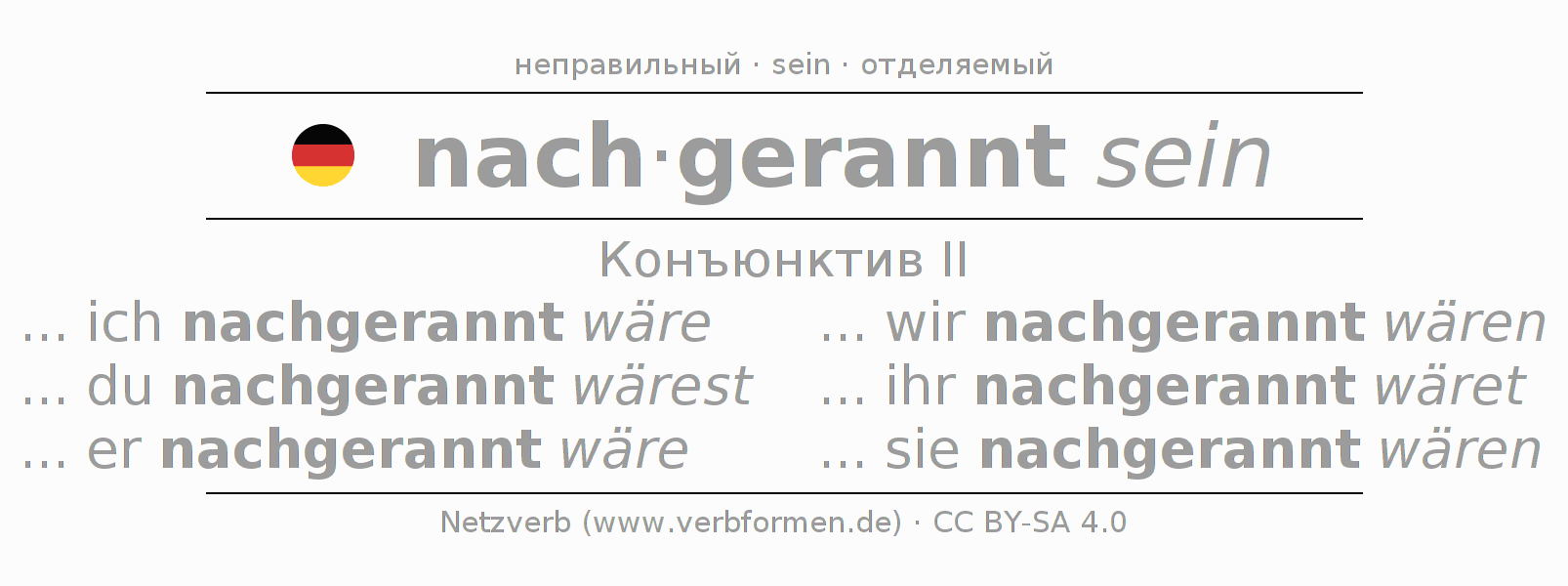 Спряжение nachrennen в Koнъюнктив Претеритум Сослагательное наклонение Пассив с sein: ... ich nachgerannt wäre, ... du nachgerannt wärest, ... er nachgerannt wäre, ... wir nachgerannt wären, ... ihr nachgerannt wäret, ... sie nachgerannt wären.Образование этих форм происходит по определённым грамматическим правилам. Так же спрягаются простые глагольные формы nachrennen в Конъюнктив II. Kомментарии ☆