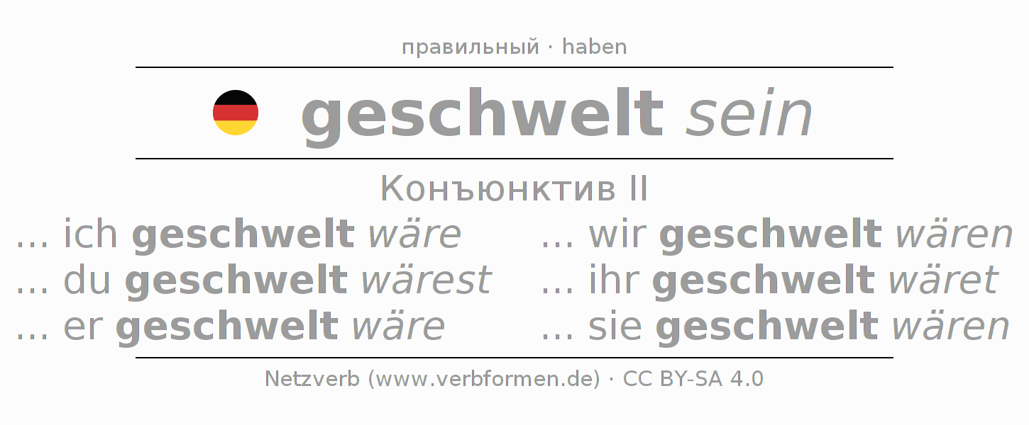 Спряжение schwelen в Koнъюнктив Претеритум Сослагательное наклонение Пассив с sein: ... ich geschwelt wäre, ... du geschwelt wärest, ... er geschwelt wäre, ... wir geschwelt wären, ... ihr geschwelt wäret, ... sie geschwelt wären.Образование этих форм происходит по определённым грамматическим правилам. Так же спрягаются простые глагольные формы schwelen в Конъюнктив II. Kомментарии ☆