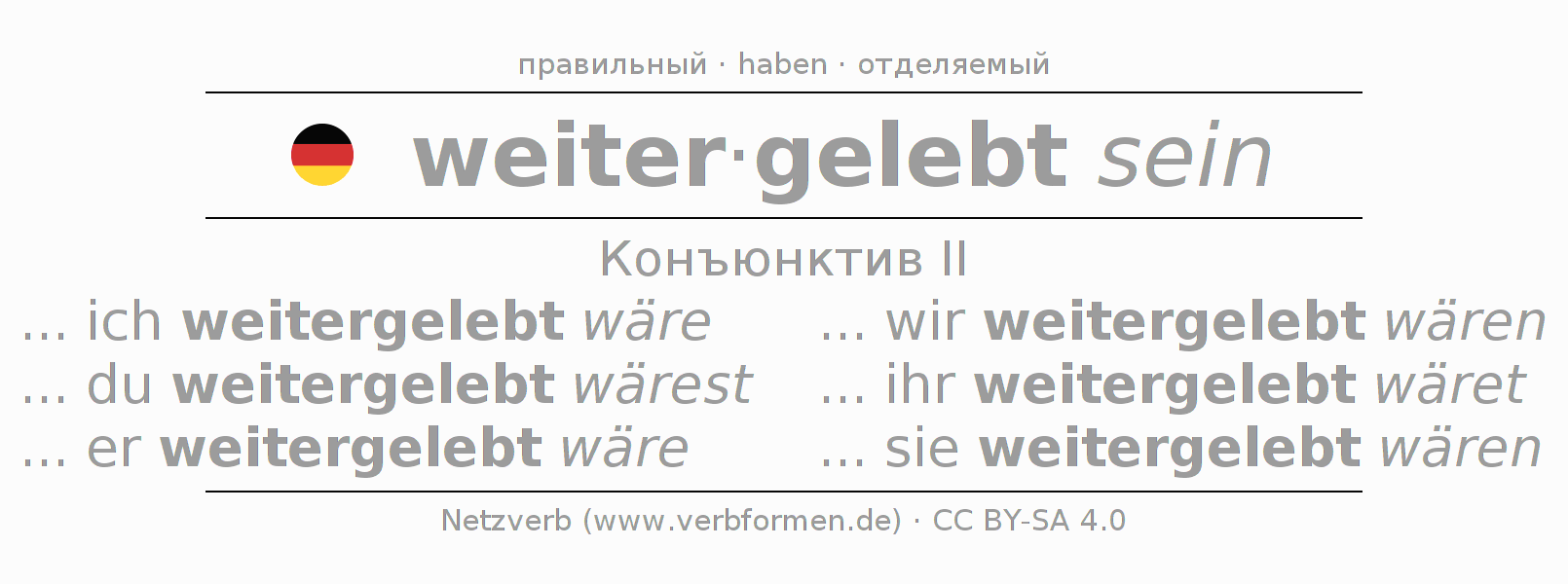 Спряжение weiterleben в Koнъюнктив Претеритум Сослагательное наклонение Пассив с sein: ... ich weitergelebt wäre, ... du weitergelebt wärest, ... er weitergelebt wäre, ... wir weitergelebt wären, ... ihr weitergelebt wäret, ... sie weitergelebt wären.Образование этих форм происходит по определённым грамматическим правилам. Так же спрягаются простые глагольные формы weiterleben в Конъюнктив II. Kомментарии ☆