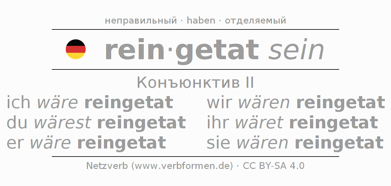 Спряжение reintun в Koнъюнктив Претеритум Сослагательное наклонение Пассив с sein: ich wäre reingetat, du wärest reingetat, er wäre reingetat, wir wären reingetat, ihr wäret reingetat, sie wären reingetat.Образование этих форм происходит по определённым грамматическим правилам. Так же спрягаются простые глагольные формы reintun в Конъюнктив II. Kомментарии ☆