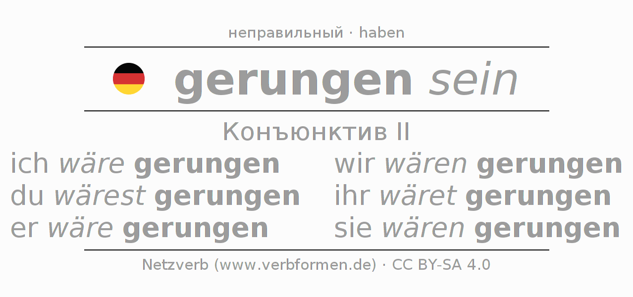 Спряжение ringen в Koнъюнктив Претеритум Сослагательное наклонение Пассив с sein: ich wäre gerungen, du wärest gerungen, er wäre gerungen, wir wären gerungen, ihr wäret gerungen, sie wären gerungen.Образование этих форм происходит по определённым грамматическим правилам. Так же спрягаются простые глагольные формы ringen в Конъюнктив II. Kомментарии ☆