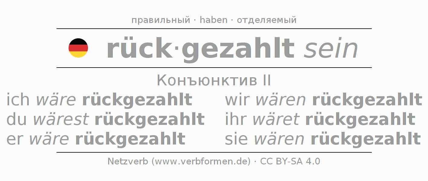 Спряжение rückzahlen в Koнъюнктив Претеритум Сослагательное наклонение Пассив с sein: ich wäre rückgezahlt, du wärest rückgezahlt, er wäre rückgezahlt, wir wären rückgezahlt, ihr wäret rückgezahlt, sie wären rückgezahlt.Образование этих форм происходит по определённым грамматическим правилам. Так же спрягаются простые глагольные формы rückzahlen в Конъюнктив II. Kомментарии ☆