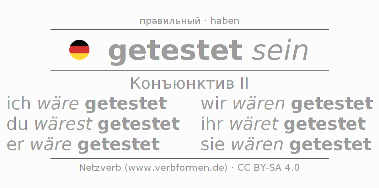 Спряжение testen в Koнъюнктив Претеритум Сослагательное наклонение Пассив с sein: ich wäre getestet, du wärest getestet, er wäre getestet, wir wären getestet, ihr wäret getestet, sie wären getestet.Образование этих форм происходит по определённым грамматическим правилам. Так же спрягаются простые глагольные формы testen в Конъюнктив II. Kомментарии ☆