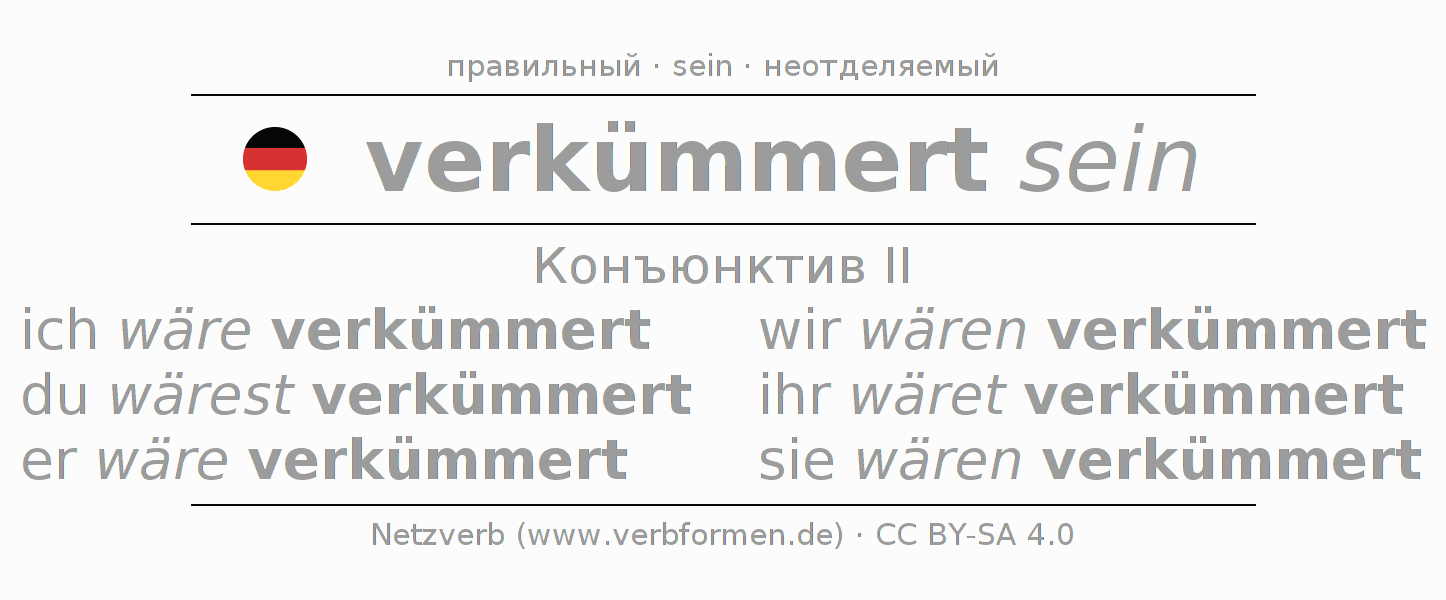 Спряжение verkümmern в Koнъюнктив Претеритум Сослагательное наклонение Пассив с sein: ich wäre verkümmert, du wärest verkümmert, er wäre verkümmert, wir wären verkümmert, ihr wäret verkümmert, sie wären verkümmert.Образование этих форм происходит по определённым грамматическим правилам. Так же спрягаются простые глагольные формы verkümmern в Конъюнктив II. Kомментарии ☆