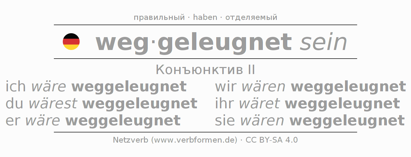 Спряжение wegleugnen в Koнъюнктив Претеритум Сослагательное наклонение Пассив с sein: ich wäre weggeleugnet, du wärest weggeleugnet, er wäre weggeleugnet, wir wären weggeleugnet, ihr wäret weggeleugnet, sie wären weggeleugnet.Образование этих форм происходит по определённым грамматическим правилам. Так же спрягаются простые глагольные формы wegleugnen в Конъюнктив II. Kомментарии ☆