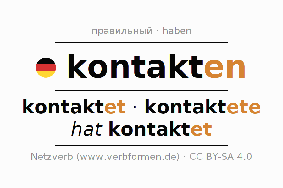 - Презенс: ich kontakte, du kontaktest, er kontakte, wir kontakten, ihr kontaktet, sie kontakten
