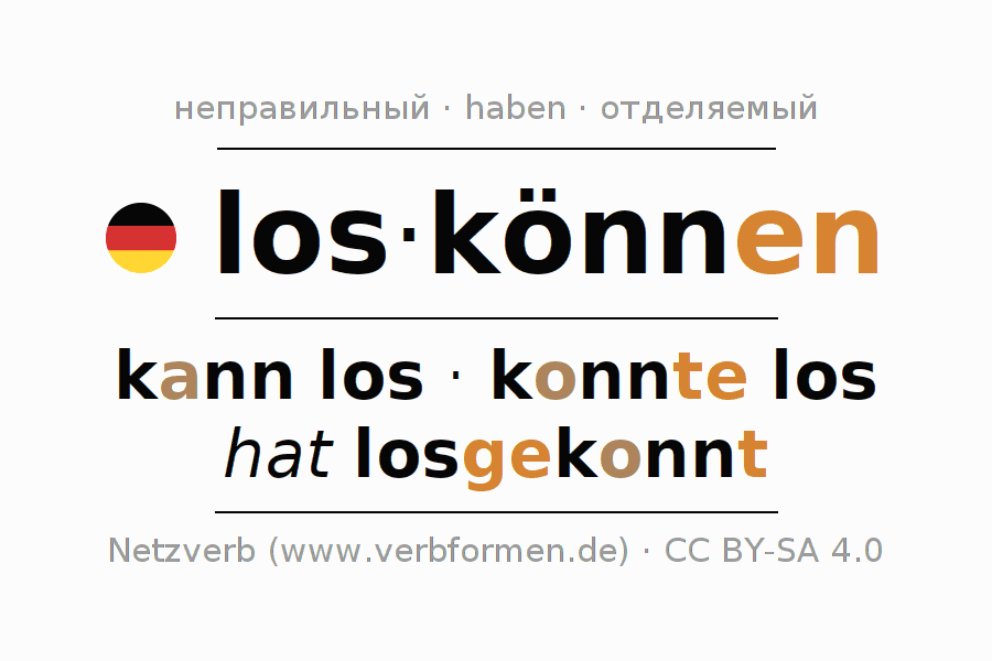 Глагол 'los·können' онлайн как таблица глаголов со всеми наглядно представленными формами. Значение глагола los·können таким образом является помощью для выполнения домашних заданий; подготовки к экзаменам и контрольным работам, а также к урокам немецкого языка; для обучения в вузах и при получении образования для взрослых. Именно для изучающих немецкий язык – правильное спряжение глаголов (kann los - konnte los - hat losgekonnt) является решающим фактором.
