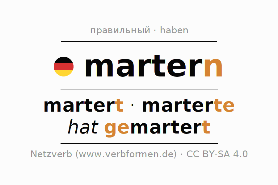 - Перфект: ich habe gemartert, du hast gemartert, er hat gemartert, wir haben gemartert, ihr habt gemartert, sie haben gemartert