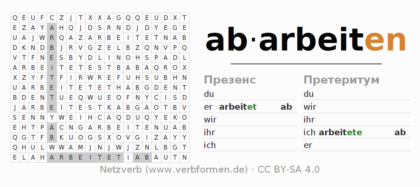 С помощью этих головоломок по поиску слов Вы можете подходящим для Вас способом изучать спряжение немецкого глагола abarbeiten.