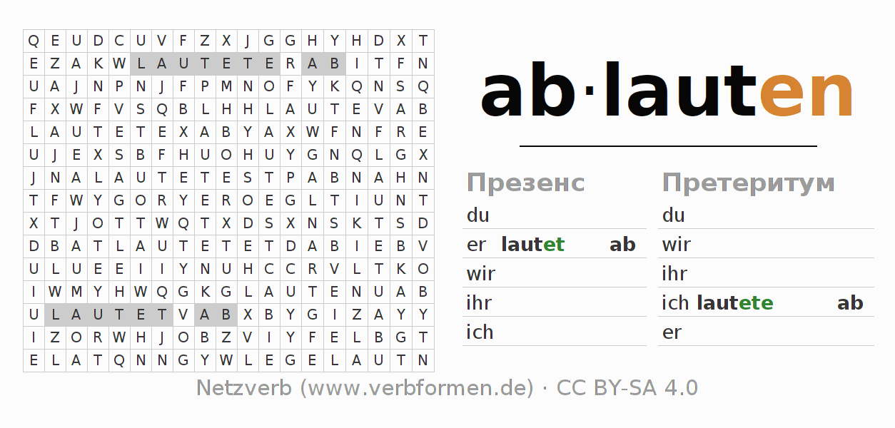 С помощью этих головоломок по поиску слов Вы можете подходящим для Вас способом изучать спряжение немецкого глагола ablauten.