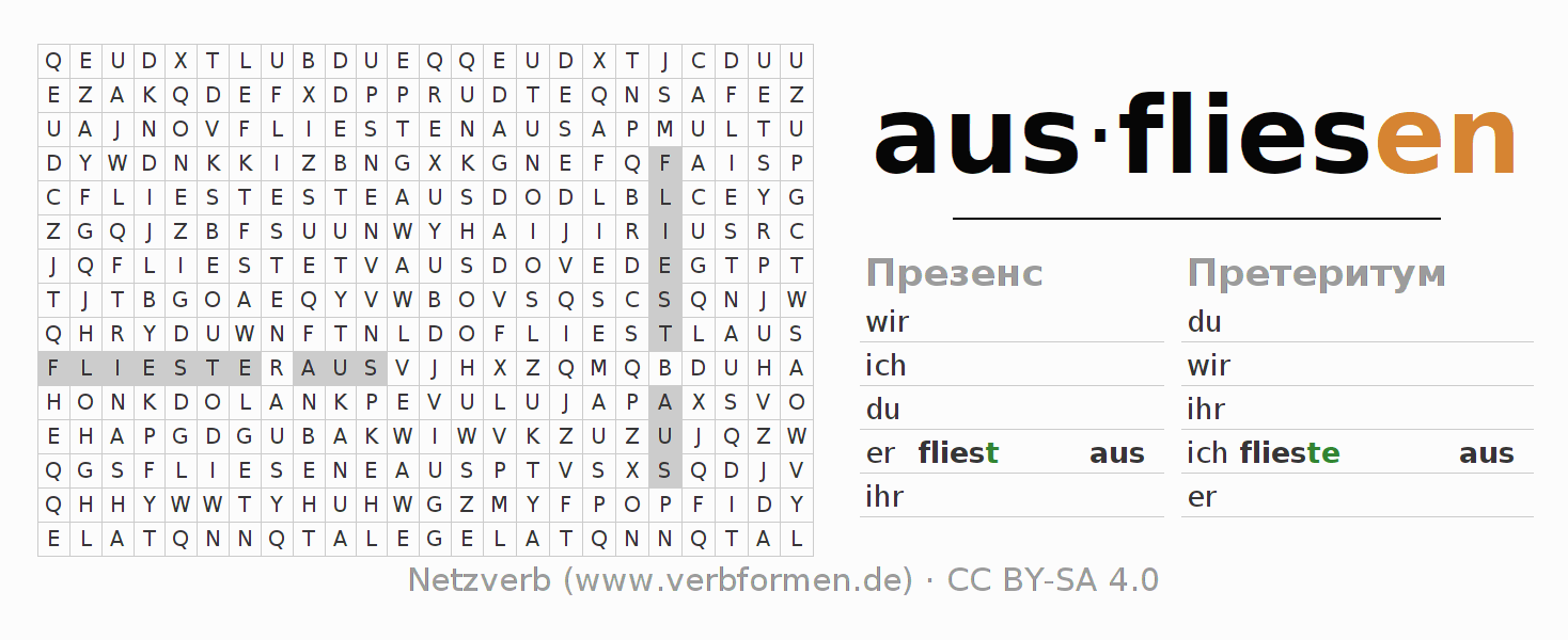 С помощью этих головоломок по поиску слов Вы можете подходящим для Вас способом изучать спряжение немецкого глагола ausfliesen.