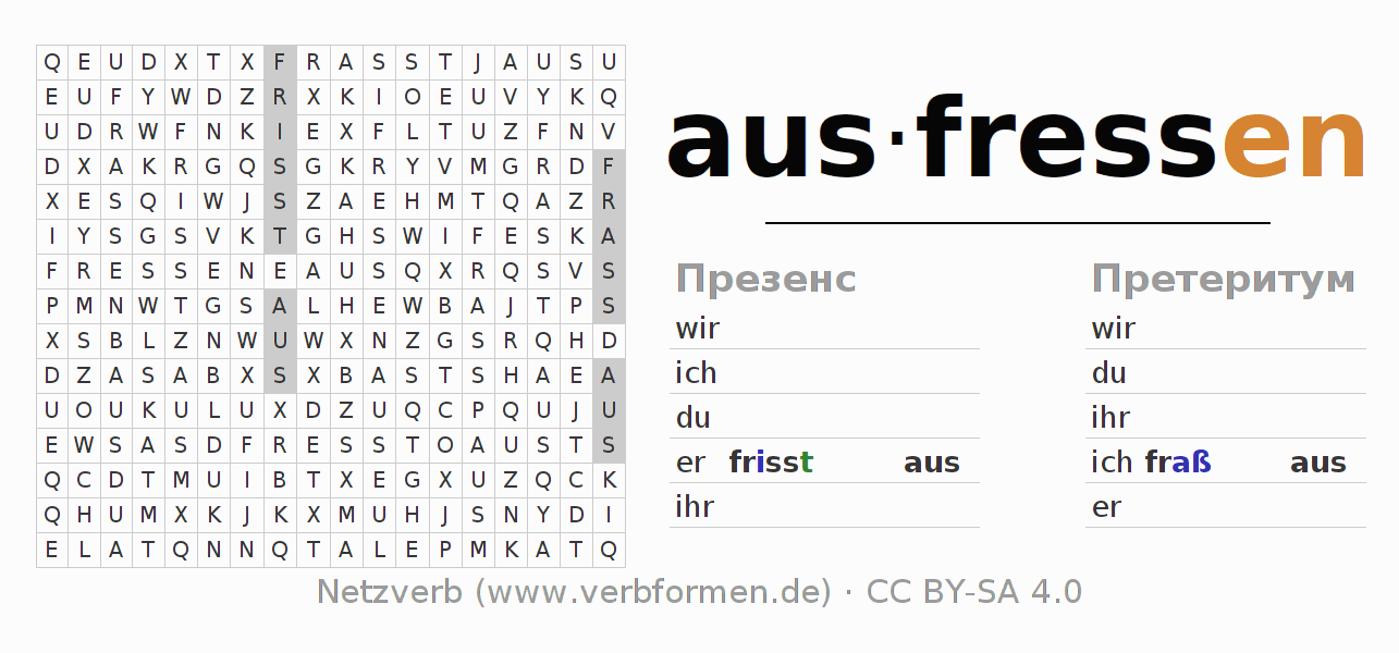 С помощью этих головоломок по поиску слов Вы можете подходящим для Вас способом изучать спряжение немецкого глагола ausfressen.