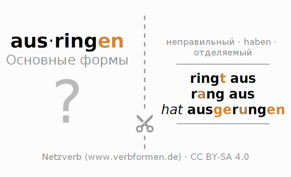 Глагольные таблицы, содержащие все формы глагола ausringen, для наглядности объединены в одну общую таблицу.