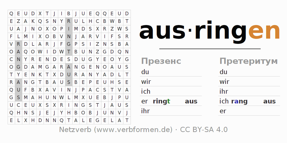 Рабочие материалы служат обучением спряжениям глагола ausringen на уроке и при самообучении. Рабочие материалы могут быть свободно использованы в рамках лицензии CC BY-SA 4.0 в виде Открытых образовательных ресурсов(ООР) например могут быть бесплатно использованы на уроке. Для этого имеется много различных типов рабочих материалов для глагола ausringen в наличии. Это таблицы спряжений, головоломки и игры. Весь учебный материал доступен бесплатно как файлы PDF, в виде изображений или как интерактивная версия браузера. В дополнение к задачам, имеются бесчисленные примеры для ausringen а также помощь в использовании глаголов.