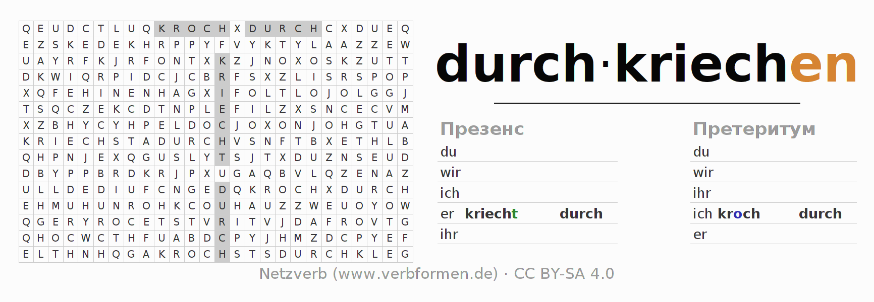 С помощью этих головоломок по поиску слов Вы можете подходящим для Вас способом изучать спряжение немецкого глагола durchkriechen.