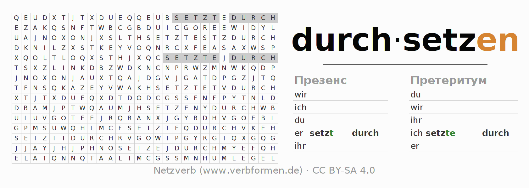 Рабочие материалы служат обучением спряжениям глагола durchsetzen на уроке и при самообучении. Рабочие материалы могут быть свободно использованы в рамках лицензии CC BY-SA 4.0 в виде Открытых образовательных ресурсов(ООР) например могут быть бесплатно использованы на уроке. Для этого имеется много различных типов рабочих материалов для глагола durchsetzen в наличии. Это таблицы спряжений, головоломки и игры. Весь учебный материал доступен бесплатно как файлы PDF, в виде изображений или как интерактивная версия браузера. В дополнение к задачам, имеются бесчисленные примеры для durchsetzen а также помощь в использовании глаголов.