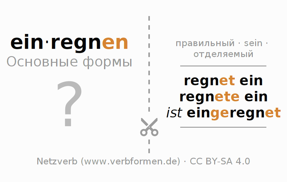 Глагольные таблицы, содержащие все формы глагола einregnen, для наглядности объединены в одну общую таблицу.