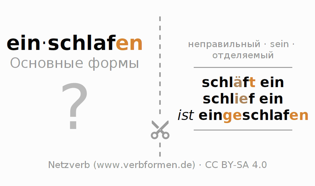 Глагольные таблицы, содержащие все формы глагола einschlafen, для наглядности объединены в одну общую таблицу.