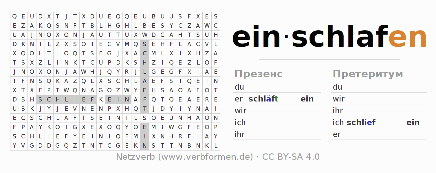 Рабочие материалы служат обучением спряжениям глагола einschlafen на уроке и при самообучении. Рабочие материалы могут быть свободно использованы в рамках лицензии CC BY-SA 4.0 в виде Открытых образовательных ресурсов(ООР) например могут быть бесплатно использованы на уроке. Для этого имеется много различных типов рабочих материалов для глагола einschlafen в наличии. Это таблицы спряжений, головоломки и игры. Весь учебный материал доступен бесплатно как файлы PDF, в виде изображений или как интерактивная версия браузера. В дополнение к задачам, имеются бесчисленные примеры для einschlafen а также помощь в использовании глаголов.
