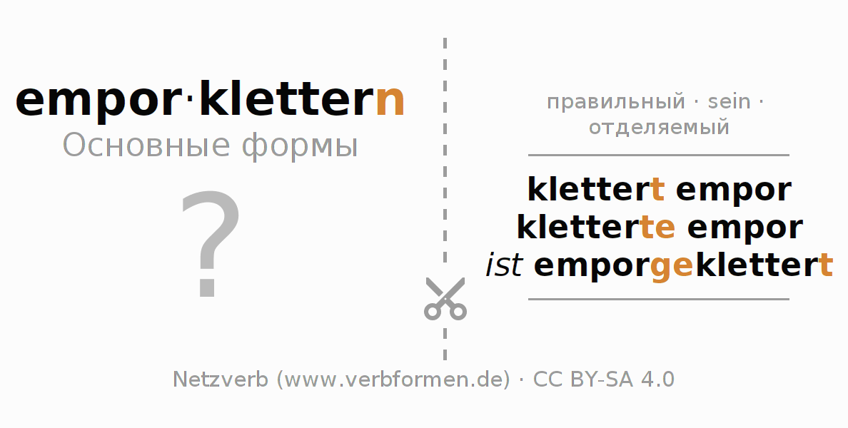 Глагольные таблицы, содержащие все формы глагола emporklettern, для наглядности объединены в одну общую таблицу.
