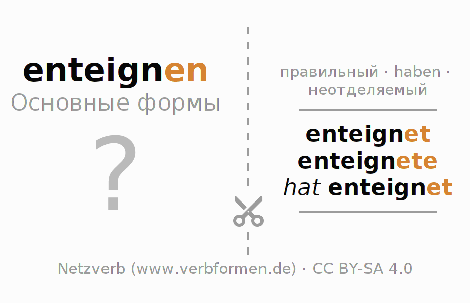 Глагольные таблицы, содержащие все формы глагола enteignen, для наглядности объединены в одну общую таблицу.