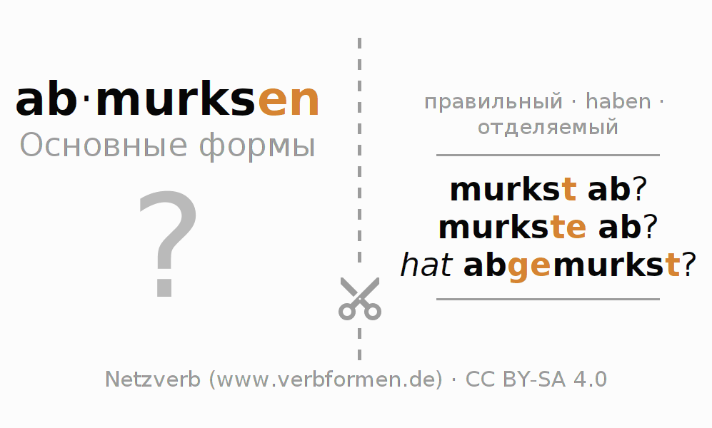 Глагольные таблицы, содержащие все формы глагола abmurksen, для наглядности объединены в одну общую таблицу.