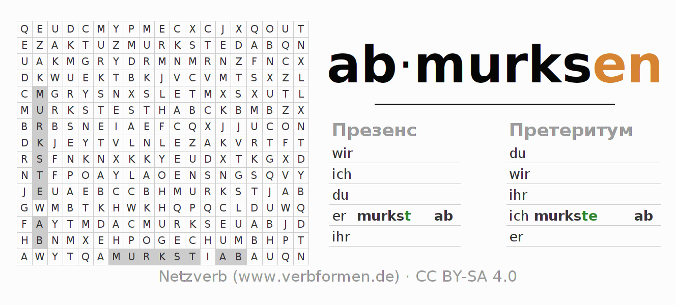 Рабочие материалы служат обучением спряжениям глагола abmurksen на уроке и при самообучении. Рабочие материалы могут быть свободно использованы в рамках лицензии CC BY-SA 4.0 в виде Открытых образовательных ресурсов(ООР) например могут быть бесплатно использованы на уроке. Для этого имеется много различных типов рабочих материалов для глагола abmurksen в наличии. Это таблицы спряжений, головоломки и игры. Весь учебный материал доступен бесплатно как файлы PDF, в виде изображений или как интерактивная версия браузера. В дополнение к задачам, имеются бесчисленные примеры для abmurksen а также помощь в использовании глаголов.