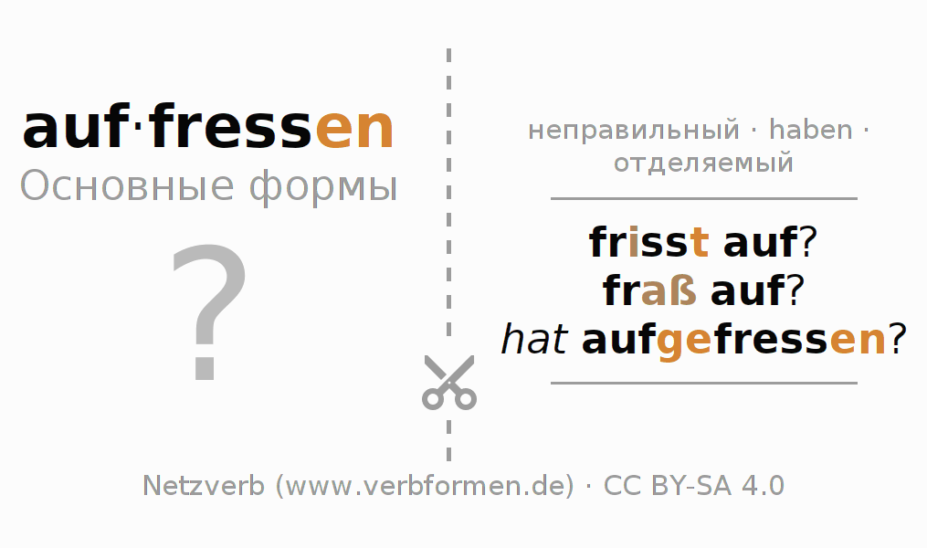 С помощью обучающих карточек можно эффективно и удобно изучать и запоминать глагольные формы auffressen. Обучающие карточки можно распечатать в формате PDF и вырезать.