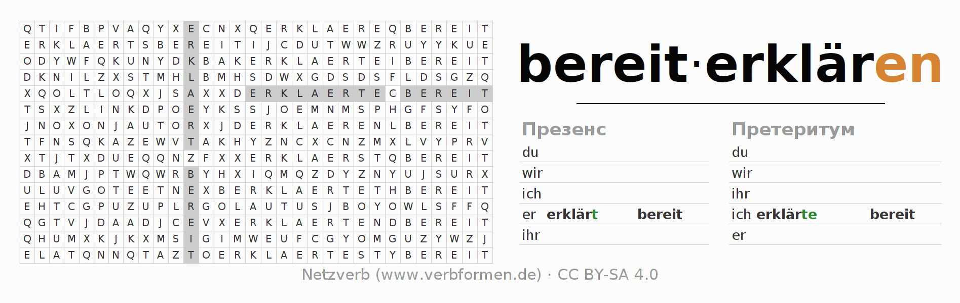 С помощью этих головоломок по поиску слов Вы можете подходящим для Вас способом изучать спряжение немецкого глагола bereiterklären.