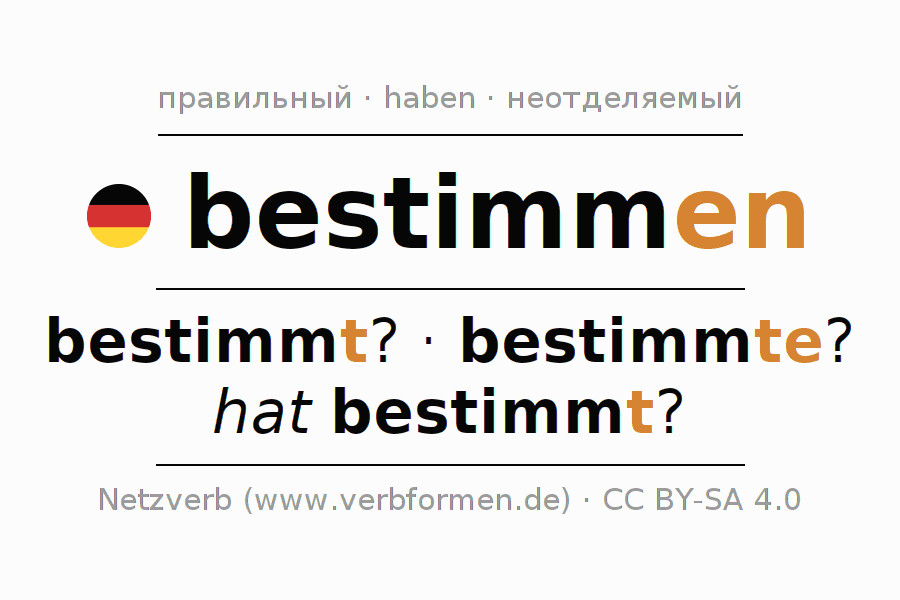 Глагольные таблицы, содержащие все формы глагола bestimmen, для наглядности объединены в одну общую таблицу.