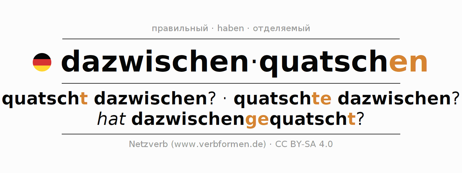 Глагольные таблицы, содержащие все формы глагола dazwischenquatschen, для наглядности объединены в одну общую таблицу.