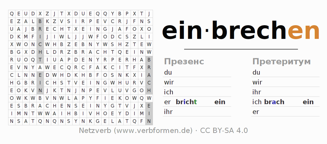 Рабочие материалы служат обучением спряжениям глагола einbrechen на уроке и при самообучении. Рабочие материалы могут быть свободно использованы в рамках лицензии CC BY-SA 4.0 в виде Открытых образовательных ресурсов(ООР) например могут быть бесплатно использованы на уроке. Для этого имеется много различных типов рабочих материалов для глагола einbrechen (hat) в наличии. Это таблицы спряжений, головоломки и игры. Весь учебный материал доступен бесплатно как файлы PDF, в виде изображений или как интерактивная версия браузера. В дополнение к задачам, имеются бесчисленные примеры для einbrechen а также помощь в использовании глаголов.