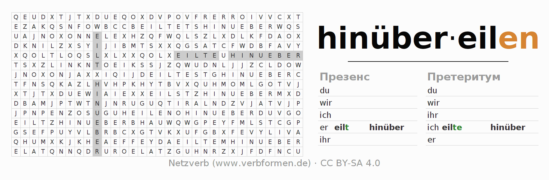 С помощью этих головоломок по поиску слов Вы можете подходящим для Вас способом изучать спряжение немецкого глагола hinübereilen.