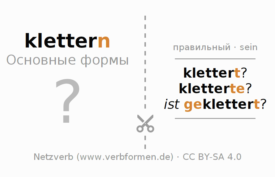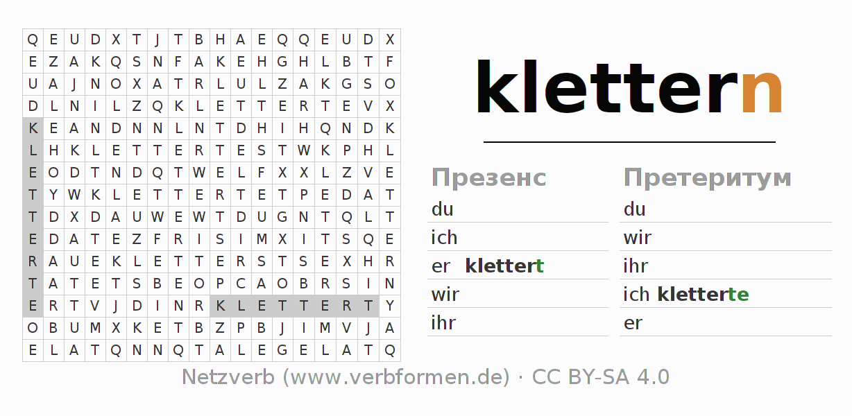 Рабочие материалы служат обучением спряжениям глагола klettern на уроке и при самообучении. Рабочие материалы могут быть свободно использованы в рамках лицензии CC BY-SA 4.0 в виде Открытых образовательных ресурсов(ООР) например могут быть бесплатно использованы на уроке. Для этого имеется много различных типов рабочих материалов для глагола klettern (ist) в наличии. Это таблицы спряжений, головоломки и игры. Весь учебный материал доступен бесплатно как файлы PDF, в виде изображений или как интерактивная версия браузера. В дополнение к задачам, имеются бесчисленные примеры для klettern а также помощь в использовании глаголов.
