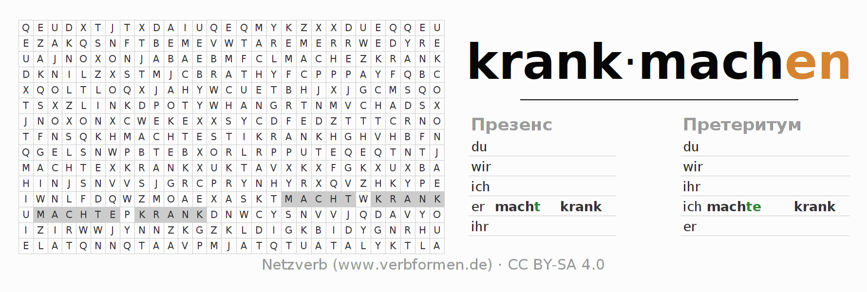 С помощью этих головоломок по поиску слов Вы можете подходящим для Вас способом изучать спряжение немецкого глагола krankmachen.