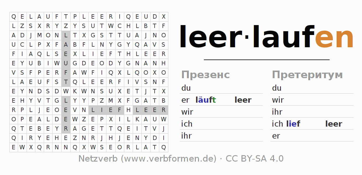 С помощью этих головоломок по поиску слов Вы можете подходящим для Вас способом изучать спряжение немецкого глагола leerlaufen.