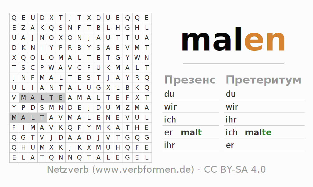 Рабочие материалы служат обучением спряжениям глагола malen на уроке и при самообучении. Рабочие материалы могут быть свободно использованы в рамках лицензии CC BY-SA 4.0 в виде Открытых образовательных ресурсов(ООР) например могут быть бесплатно использованы на уроке. Для этого имеется много различных типов рабочих материалов для глагола malen в наличии. Это таблицы спряжений, головоломки и игры. Весь учебный материал доступен бесплатно как файлы PDF, в виде изображений или как интерактивная версия браузера. В дополнение к задачам, имеются бесчисленные примеры для malen а также помощь в использовании глаголов.