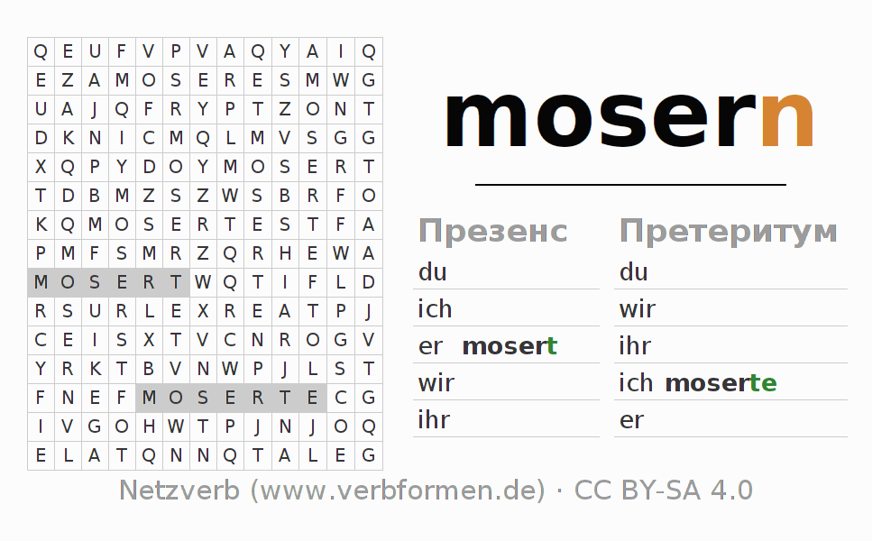 С помощью этих головоломок по поиску слов Вы можете подходящим для Вас способом изучать спряжение немецкого глагола mosern.