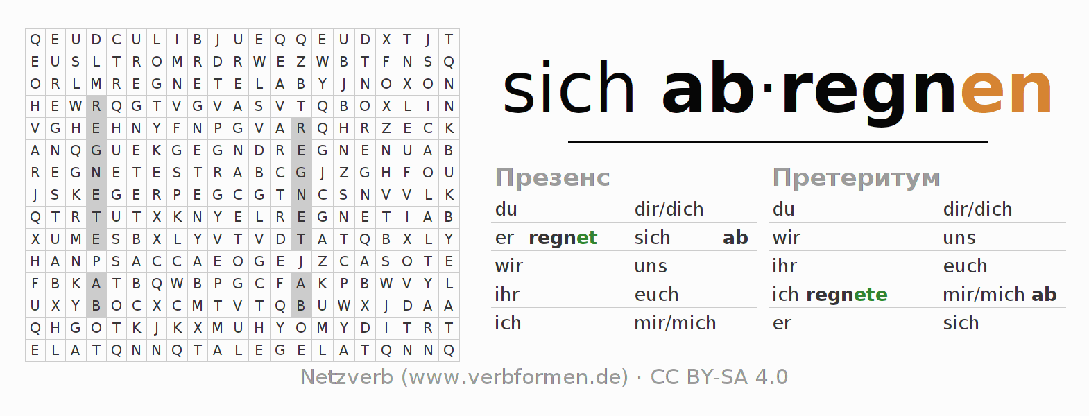 С помощью этих головоломок по поиску слов Вы можете подходящим для Вас способом изучать спряжение немецкого глагола sich abregnen.