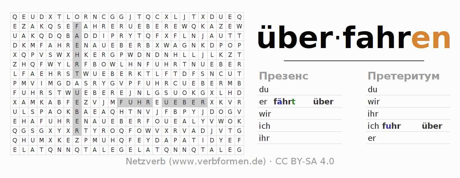 С помощью этих головоломок по поиску слов Вы можете подходящим для Вас способом изучать спряжение немецкого глагола überfahren.