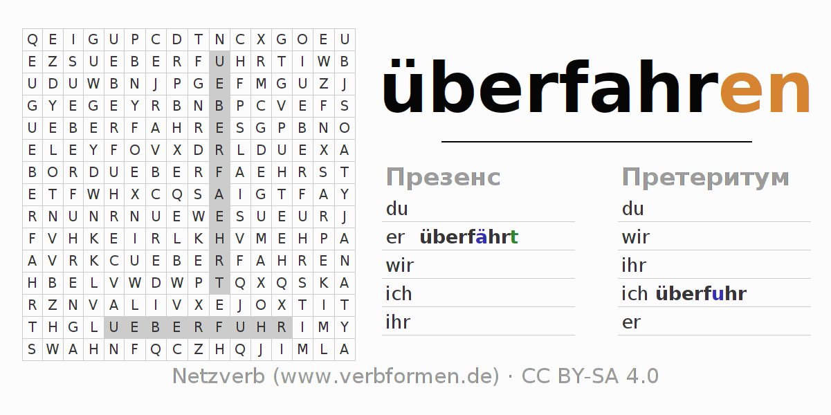 С помощью этих головоломок по поиску слов Вы можете подходящим для Вас способом изучать спряжение немецкого глагола überfahren.
