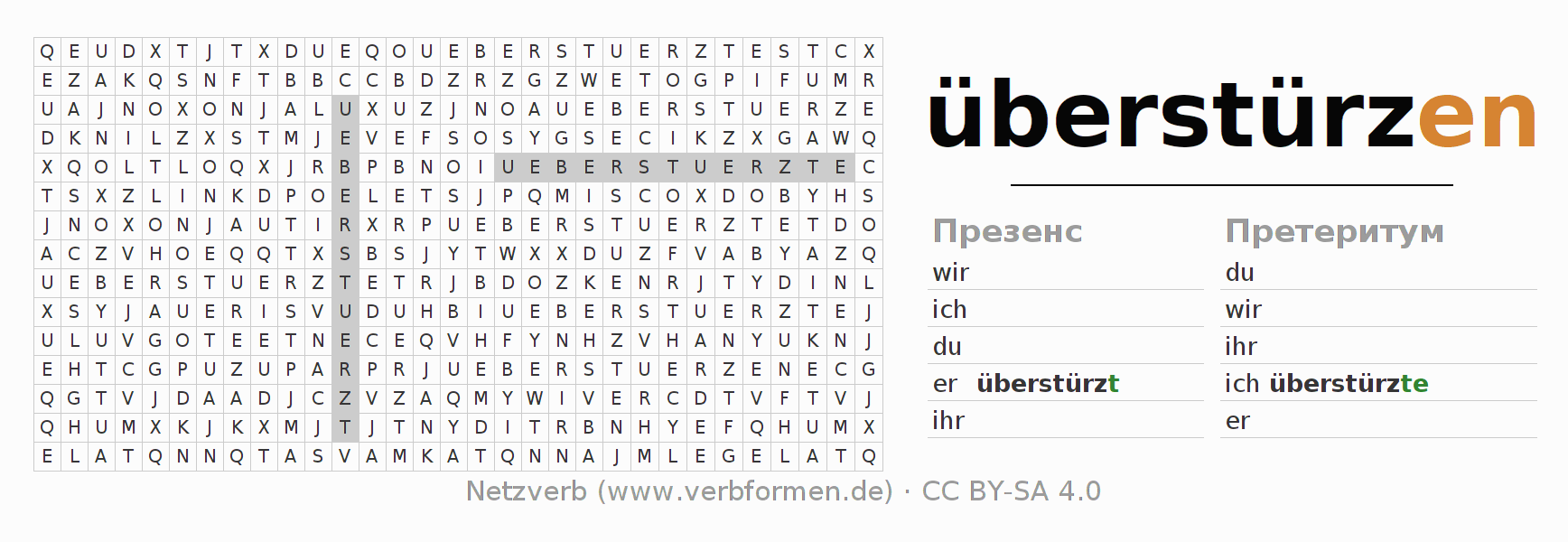 Рабочие материалы служат обучением спряжениям глагола überstürzen на уроке и при самообучении. Рабочие материалы могут быть свободно использованы в рамках лицензии CC BY-SA 4.0 в виде Открытых образовательных ресурсов(ООР) например могут быть бесплатно использованы на уроке. Для этого имеется много различных типов рабочих материалов для глагола überstürzen в наличии. Это таблицы спряжений, головоломки и игры. Весь учебный материал доступен бесплатно как файлы PDF, в виде изображений или как интерактивная версия браузера. В дополнение к задачам, имеются бесчисленные примеры для überstürzen а также помощь в использовании глаголов.
