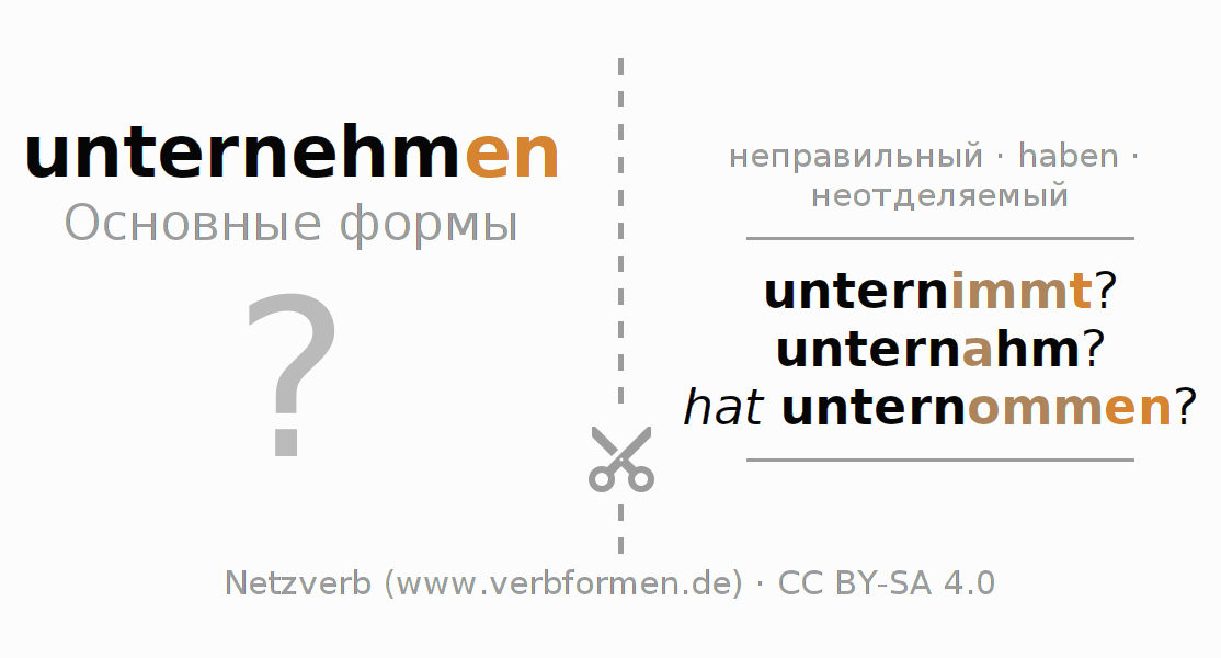 Глагольные таблицы, содержащие все формы глагола unternehmen, для наглядности объединены в одну общую таблицу.