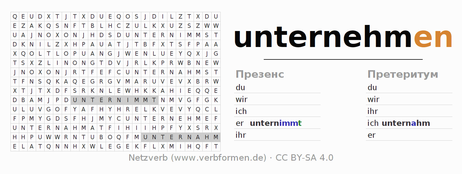 С помощью этих головоломок по поиску слов Вы можете подходящим для Вас способом изучать спряжение немецкого глагола unternehmen.