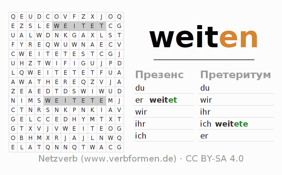 Рабочие материалы служат обучением спряжениям глагола weiten на уроке и при самообучении. Рабочие материалы могут быть свободно использованы в рамках лицензии CC BY-SA 4.0 в виде Открытых образовательных ресурсов(ООР) например могут быть бесплатно использованы на уроке. Для этого имеется много различных типов рабочих материалов для глагола weiten в наличии. Это таблицы спряжений, головоломки и игры. Весь учебный материал доступен бесплатно как файлы PDF, в виде изображений или как интерактивная версия браузера. В дополнение к задачам, имеются бесчисленные примеры для weiten а также помощь в использовании глаголов.