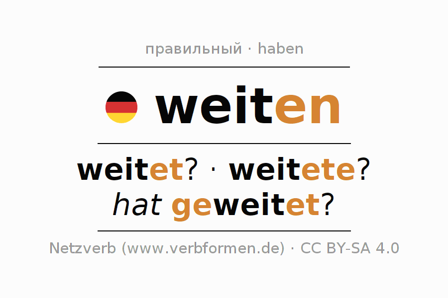 Глагольные таблицы, содержащие все формы глагола weiten, для наглядности объединены в одну общую таблицу.
